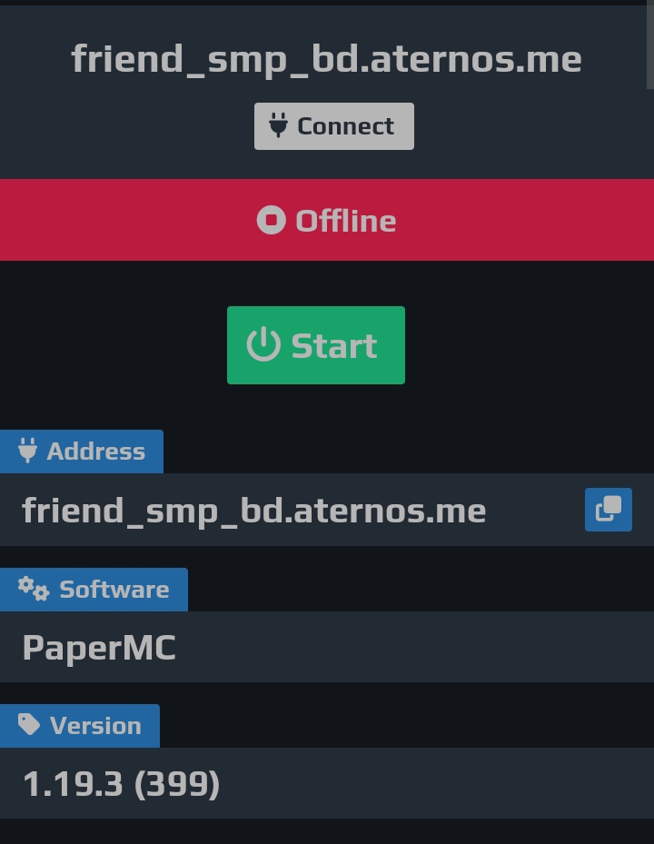 You see start button. Other side you slow server ip , software , Minecraft server join version.